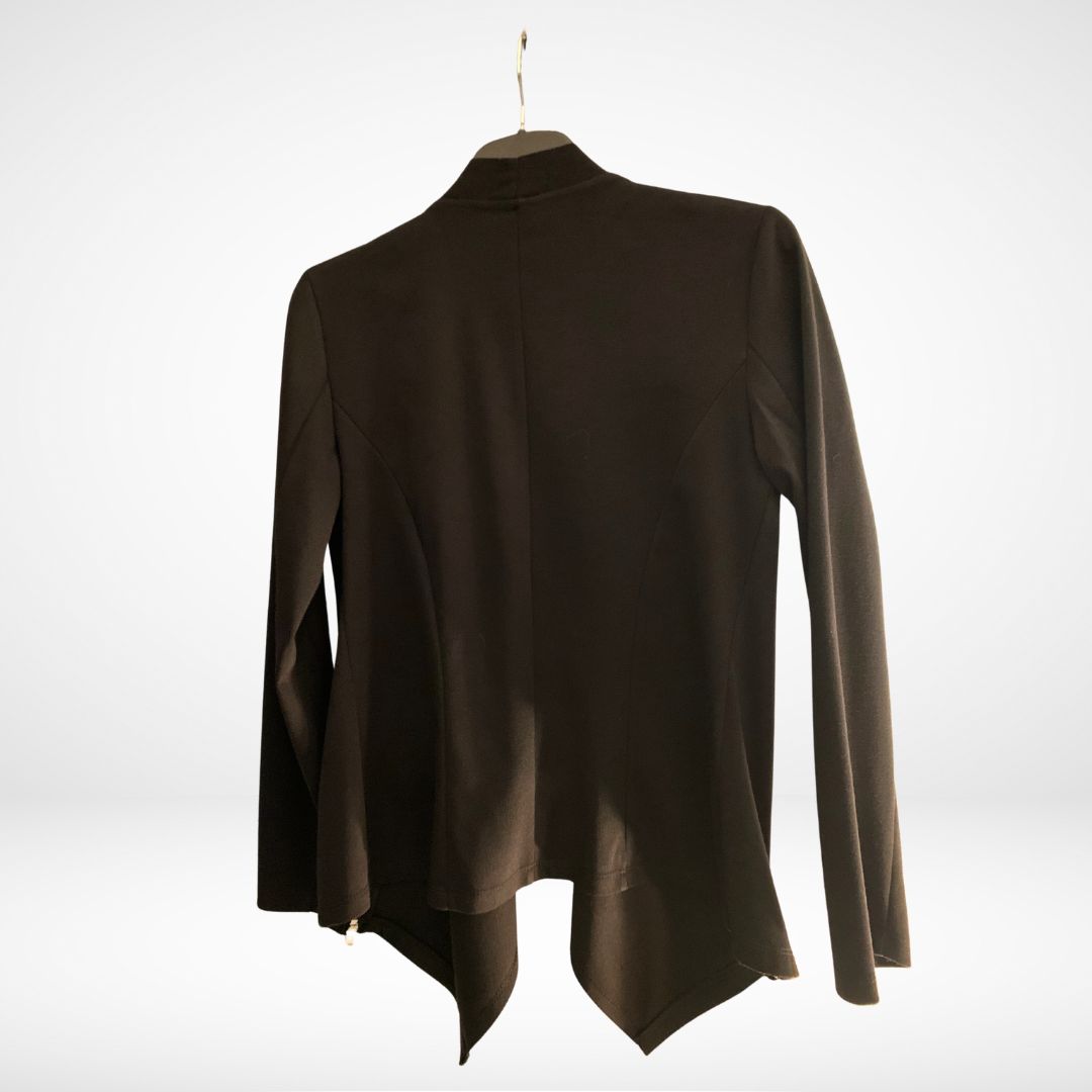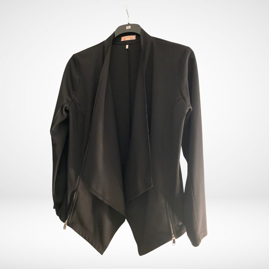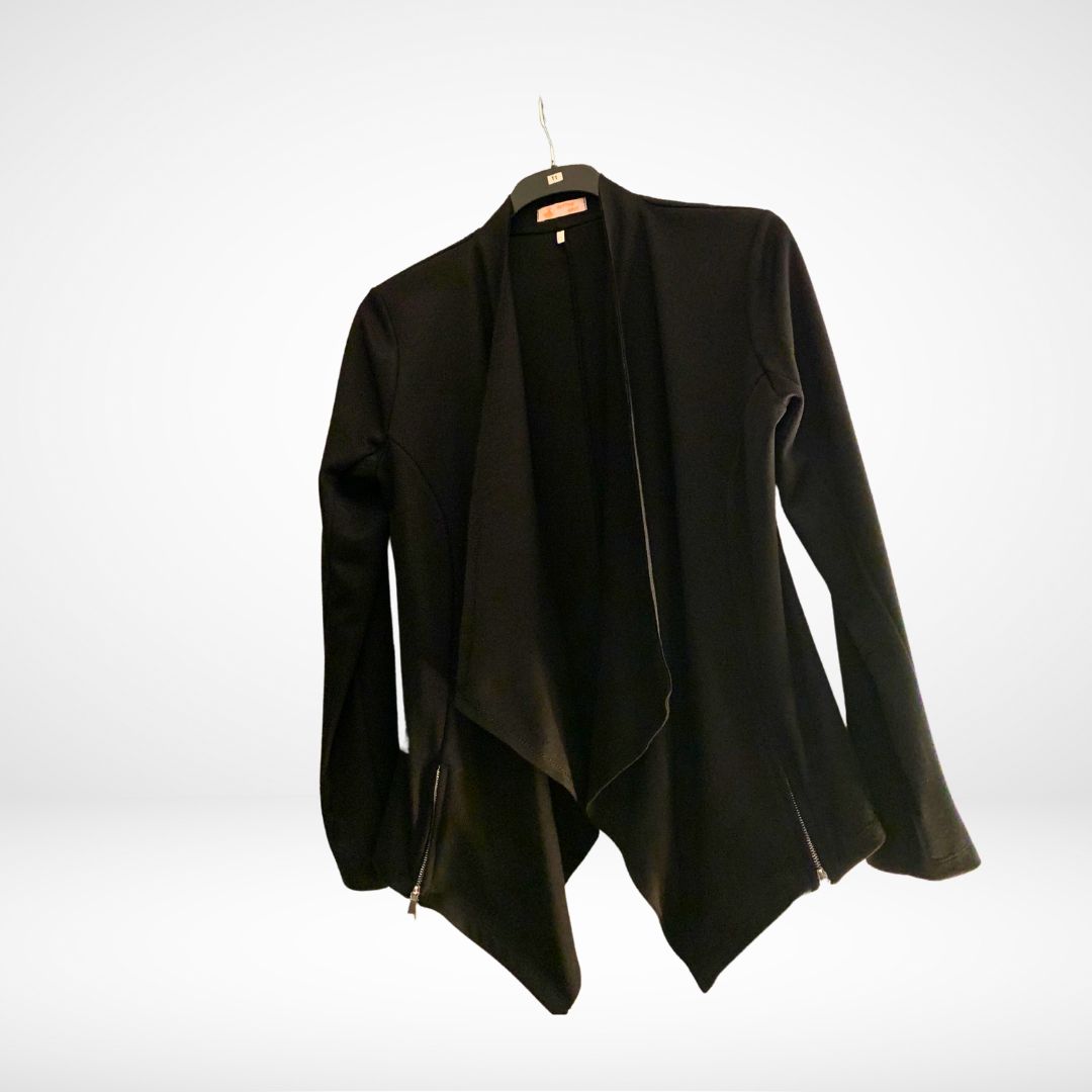 Virginie, veste noire asymétrique, légère et polyvalente, s'adapte à toutes vos tenues. Avec ses fermetures éclair de 12 cm de chaque côté, elle accompagne parfaitement la robe Harmonie. Sa longueur arrive à la hanche, idéale pour toute occasion. Facilement pliable et lavable en machine, elle vous convient partout.